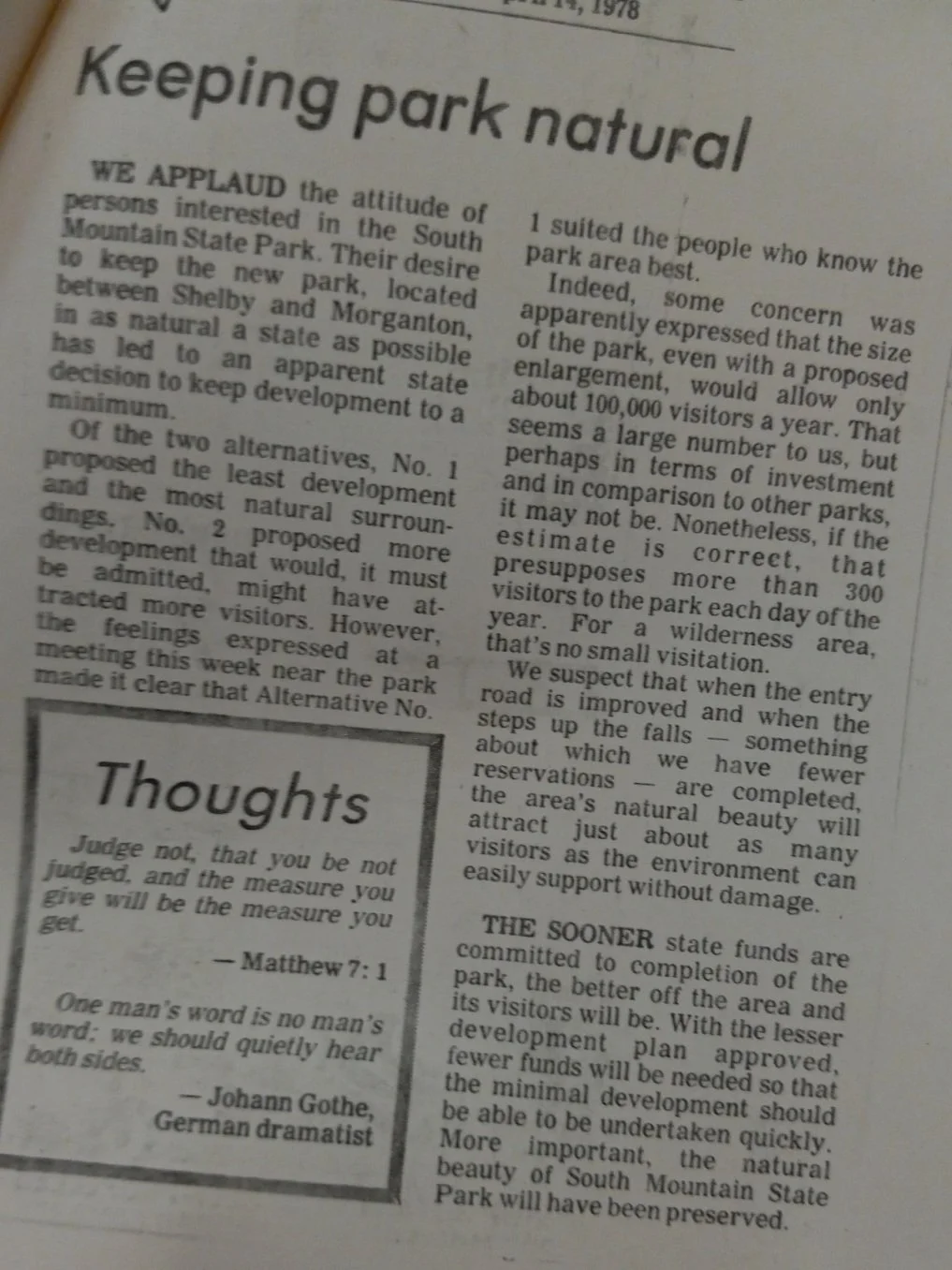 20. “Keeping Park Natural.” The Shelby Daily Star, 14 Apr. 1978. South Mountains State Park.